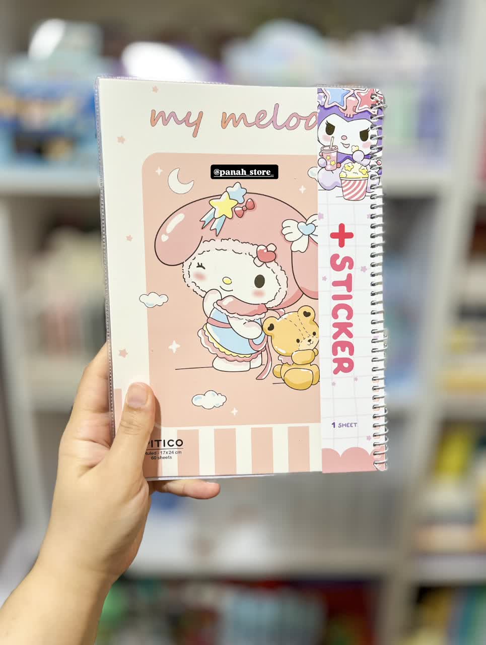 دفتر مجلد ۶۰برگ استیکردار سری کرومی- Kuromi کد ۳ـ کرومی و تدی ابعاد: ۱۷ ×۲۴سانتیمتر قطع: وزیری تعداد برگ: ۶۰برگ نوع جلد: مجلد نوع صحافی: سیمی صفحه اول دفتر یک ورق استیکر دارد.