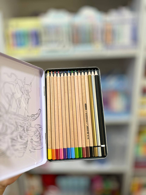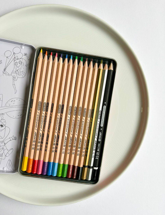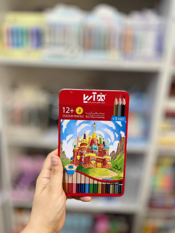 مداد رنگی ۳+۱۲ رنگ جعبه فلزی برند آریا طرح قلعه